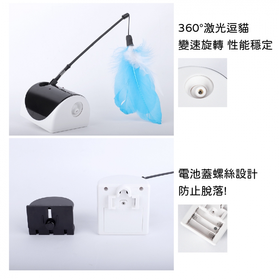 •三檔可調節逗寵功能:雷射燈模式、羽毛杆模式、 雷射燈與羽毛杆雙重運轉模式